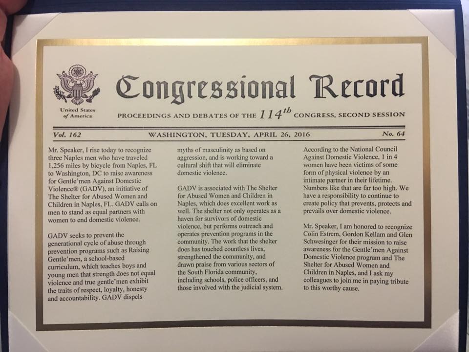 We have made it to Washington DC by bicycle and have over 1,200 miles logged to raise awareness for our cause, the GADV initiative, and to help end domestic violence. Thank you to our Florida Congressmen Mario Diaz-Balart and Curt Clawson for their time and support. Thanks to Congressman Diaz-Balart, our ride and cause was officially entered into the Congressional Record on April 26!! We also enjoyed meeting with members of Senator Bill Nelson’s staff. Tomorrow we will be in the Office of the Vice President for our final meeting with members of Washington Violence Against Women team – we can make things happen, so let’s all ride together!!