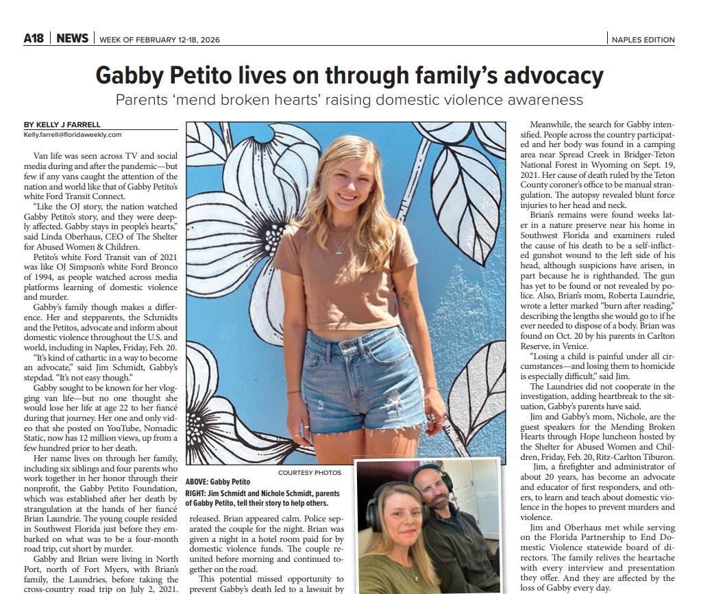 Gabby’s family though makes a difference. Her and stepparents, the Schmidts and the Petitos, advocate and inform about domestic violence throughout the U.S. and world, including in Naples, Friday, Feb. 20.