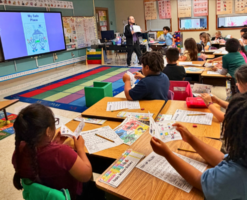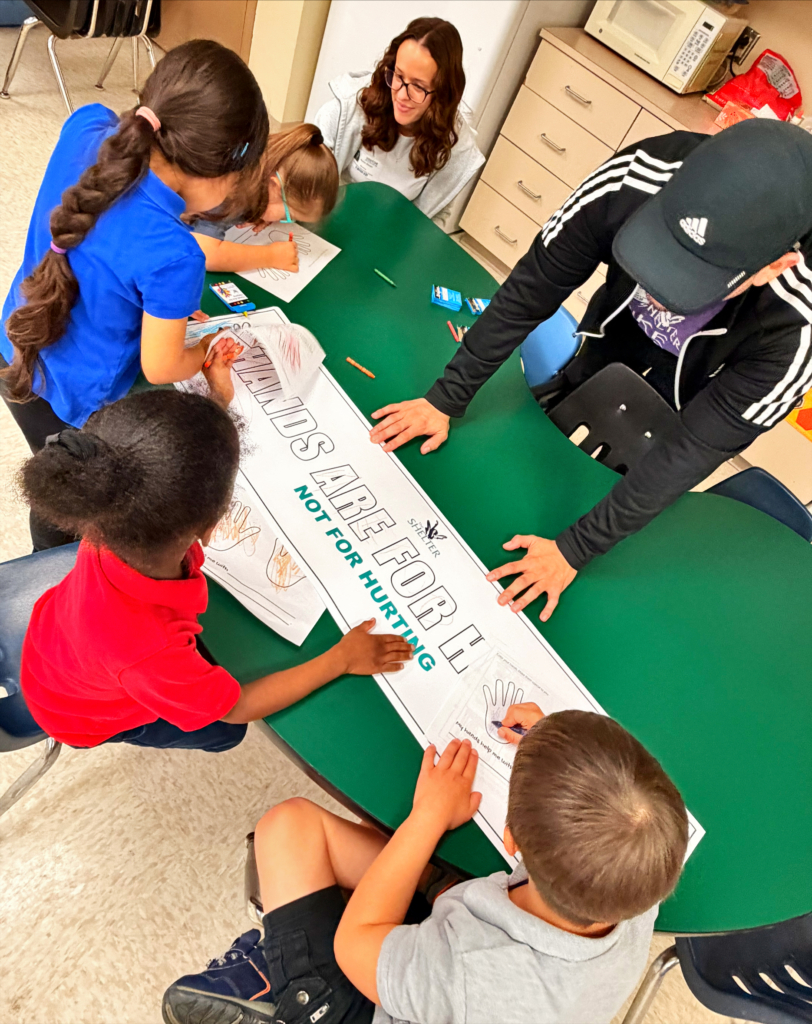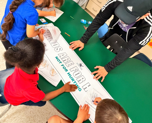Since 2000, The Shelter’s Hands are for Helping, Not for Hurting prevention program has provided preschool through first grade students with an exciting and interactive learning experience utilizing Martine Agassi’s book, “Hands are for Helping, Not for Hitting.” Children are presented with non-aggressive ways to express anger and other emotions as well as focus on positive ways to use their hands, through an interactive story time and pledge activity. Students also create their own banner with their hand stamps to display in their classroom and receive a booklet to take home as a reminder (see booklet at right). Youth participating in the Hands are for Helping, Not for Hurting program are able to: